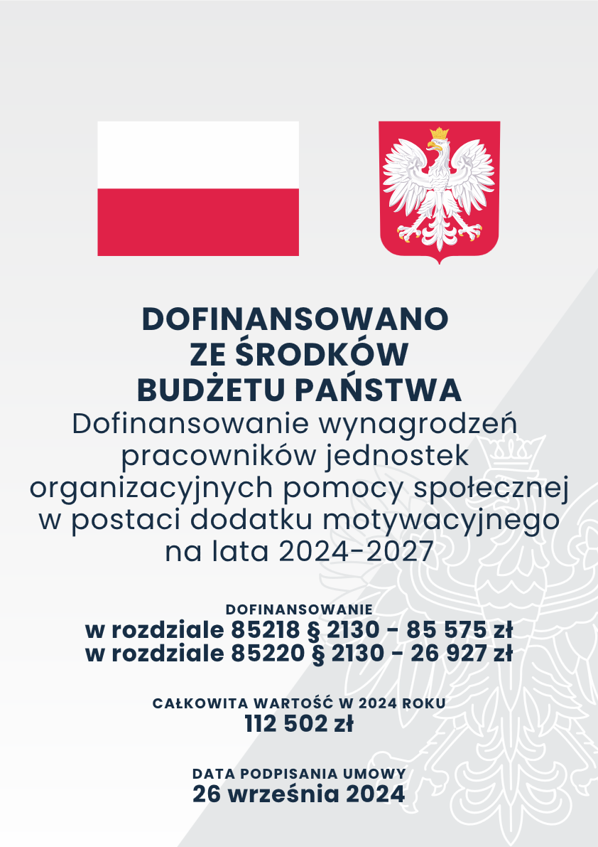 Źródłem finansowania programu jest dotacja celowa z budżetu państwa. Na podstawie Umowy Nr 1766 zawartej w dniu 26 września 2024 roku pomiędzy Wojewodą Lubelskim a Powiatem Puławskim. Powiatowi Puławskiemu przyznano dotację celową z budżetu państwa w łącznej wysokości 112 502zł, w tym dział 852, rozdział 85218 § 2130 kwotę 85 575 zł, rozdział 85220 § 2130 kwotę 26 927zł w 2024 roku. Niniejsza dotacja przeznaczona jest na zwiększenie pracownikom jednostek organizacyjnych pomocy społecznej Powiatu Puławskiego wynagrodzenia w formie dodatku motywacyjnego w wysokości 1 000zł brutto miesięcznie proporcjonalnie do wymiaru czasu pracy oraz pokrycie kosztów składek od tych wynagrodzeń w okresie od 1 lipca 2024 roku do 31 grudnia 2024 roku.