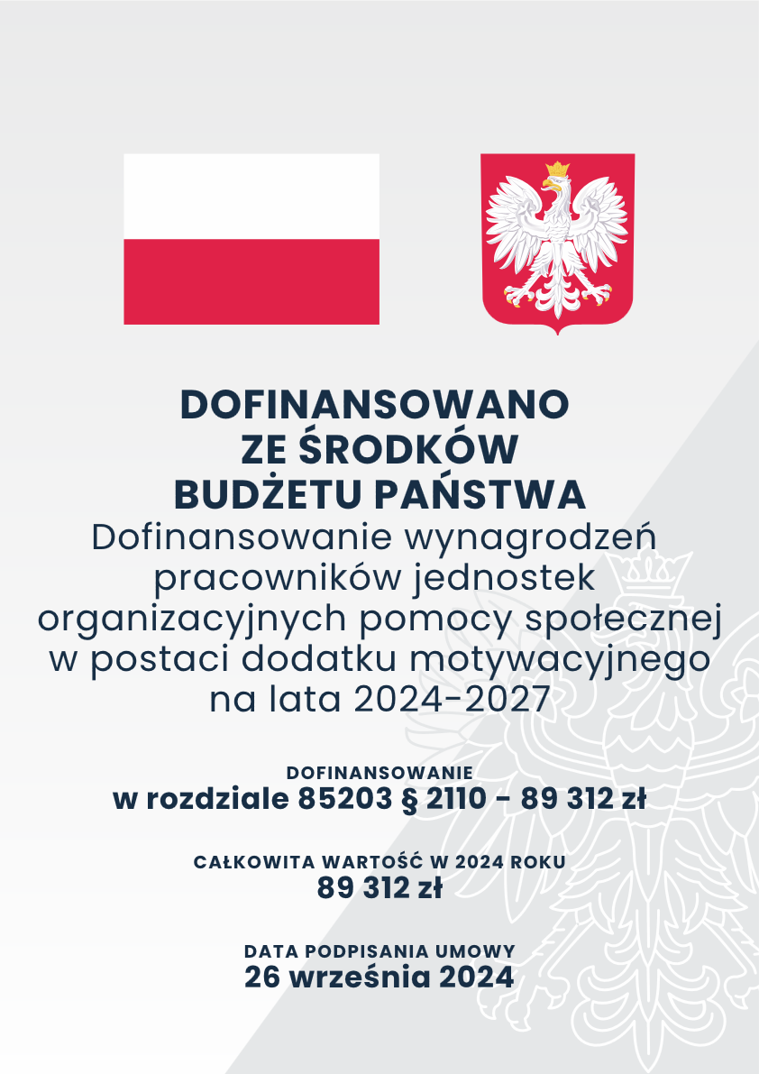 Źródłem finansowania programu jest dotacja celowa z budżetu państwa. Na podstawie Umowy Nr 1746 zawartej w dniu 26 września 2024 roku pomiędzy Wojewodą Lubelskim a Powiatem Puławskim. Powiatowi Puławskiemu przyznano dotację celową z budżetu państwa w rozdziale 85203 § 2110 w kwocie kwotę 89 312 zł w 2024 roku. Niniejsza dotacja przeznaczona jest na zwiększenie pracownikom jednostek organizacyjnych pomocy społecznej Powiatu Puławskiego wynagrodzenia w formie dodatku motywacyjnego w wysokości 1 000zł brutto miesięcznie proporcjonalnie do wymiaru czasu pracy oraz pokrycie kosztów składek od tych wynagrodzeń w okresie od 1 lipca 2024 roku do 31 grudnia 2024 roku.