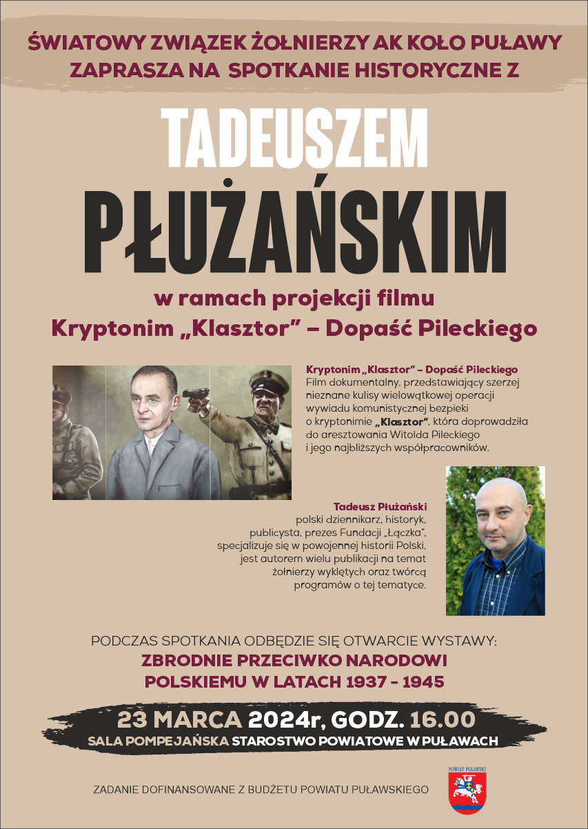 Światowy Związek Żołnierzy AK Koło Puławy zaprasza na spotkanie historyczne z Tadeuszem Płużańskim, które odbędzie się 23 marca br. o godz. 16:00 w Sali Pompejańskiej Starostwa Powiatowego w Puławach.
