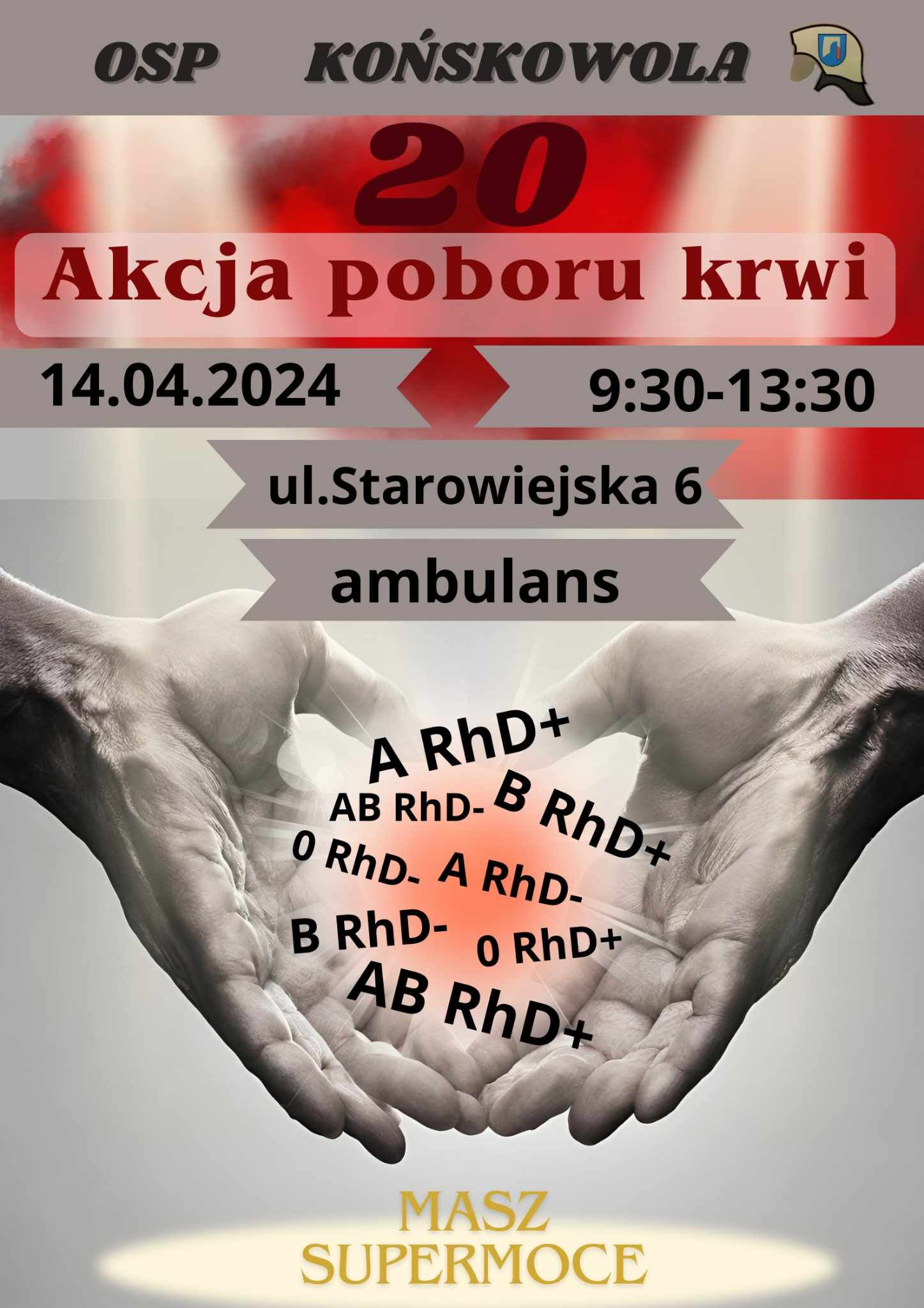 Ochotnicza Straż Pożarna w Końskowoli zaprasza na akcję poboru krwi - 14.04.2024 godz. 9:30-13:30, Końskowola ul. Starowiejska 6.