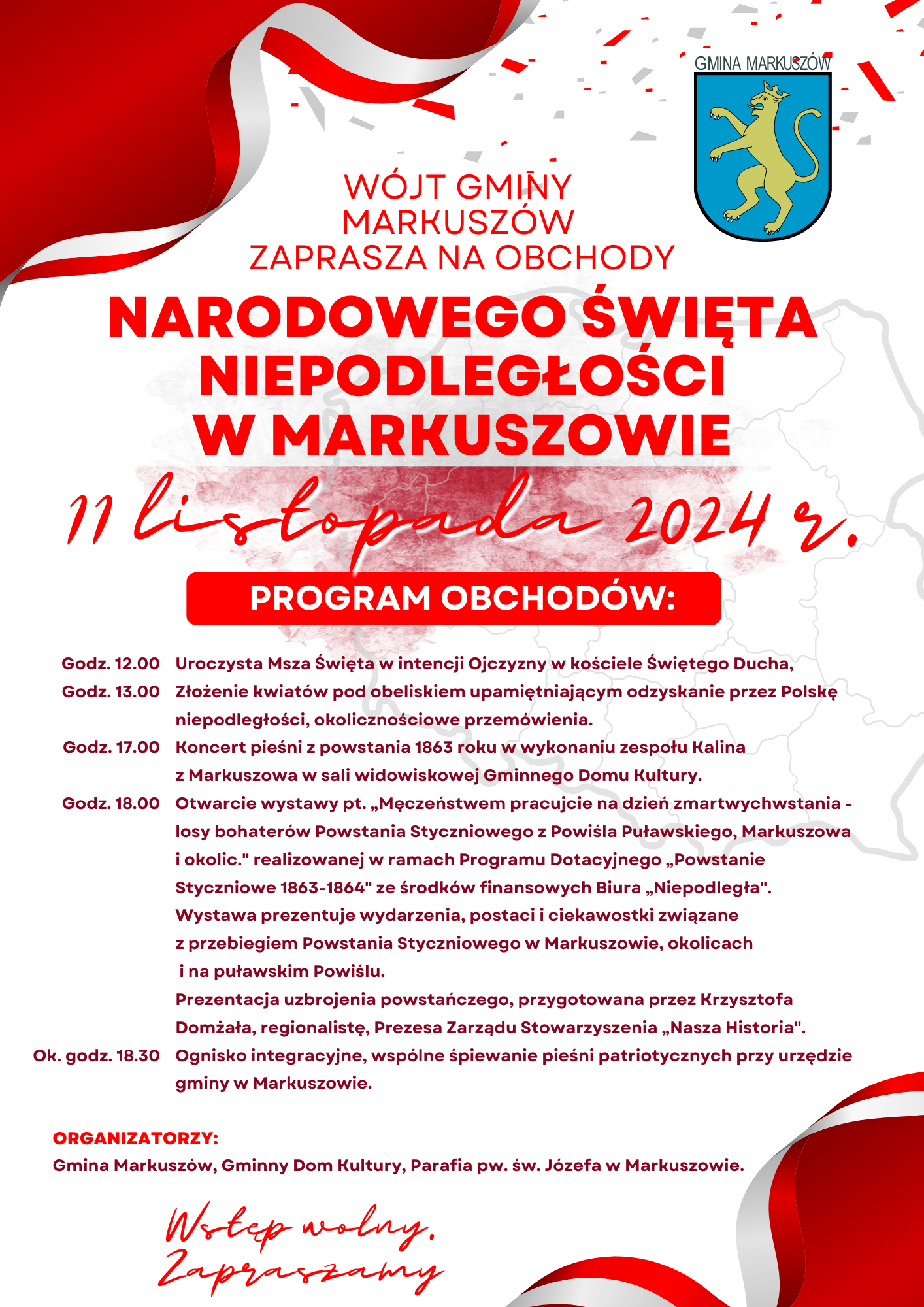 11 listopada, w 106. rocznicę odzyskania przez Polskę niepodległości, zapraszamy do udziału w obchodach Święta Niepodległości.